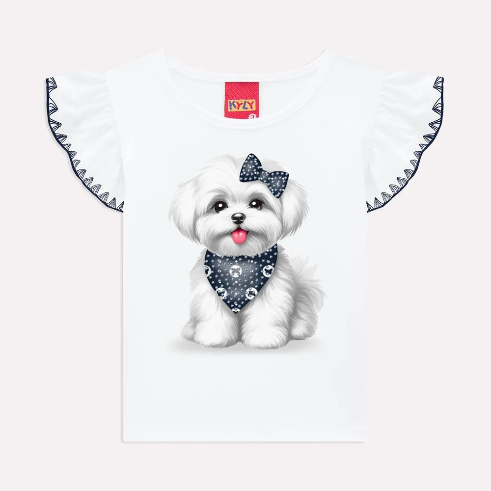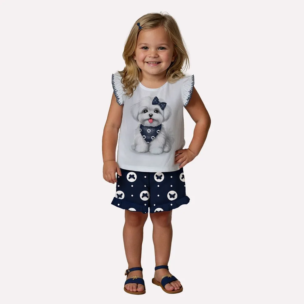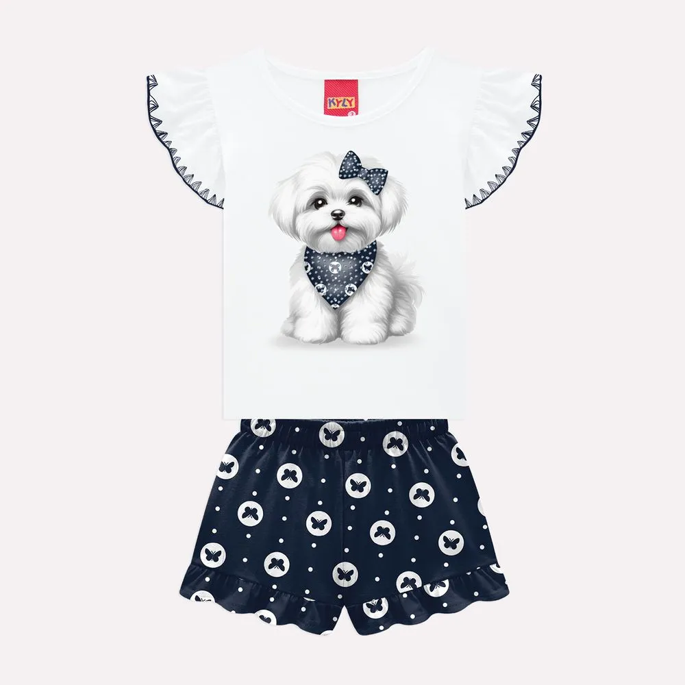 Confeccionado em meia malha 100% algodão, o conjunto é leve, macio e respirável, ideal para a pele delicada das meninas, garantindo bem-estar durante todo o dia. A blusa traz uma estampa localizada de cachorrinho com borboleta, enriquecida com aplicação de strass, que adiciona um brilho delicado e sofisticado ao visual. As mangas com franzido e o acabamento em ponto concha completam a peça com um toque romântico e gracioso, valorizando ainda mais o look.