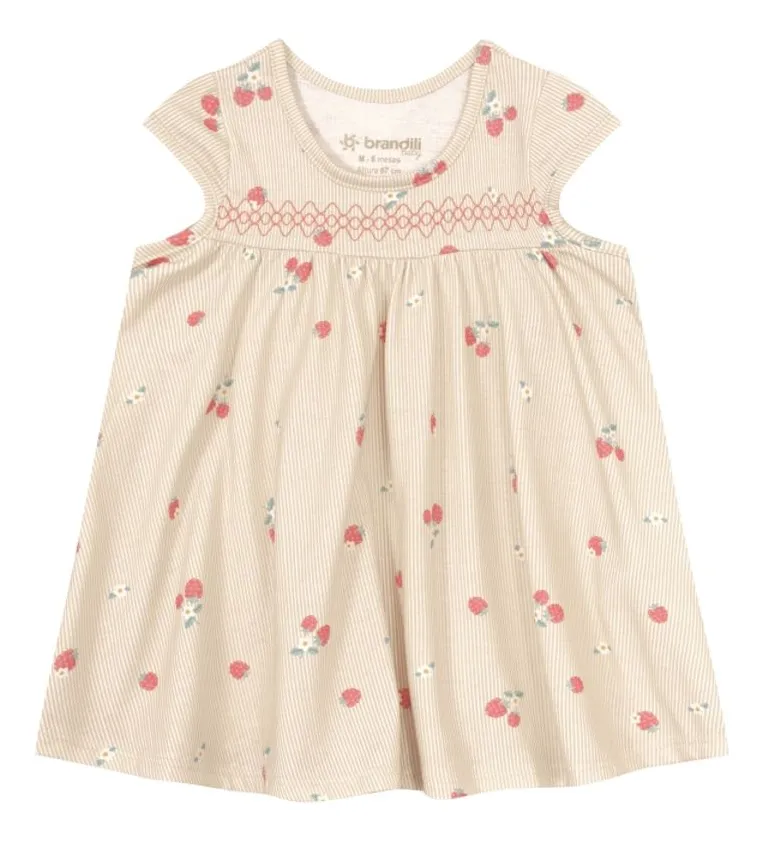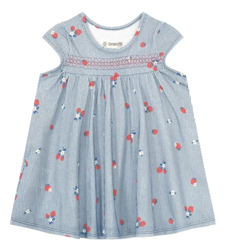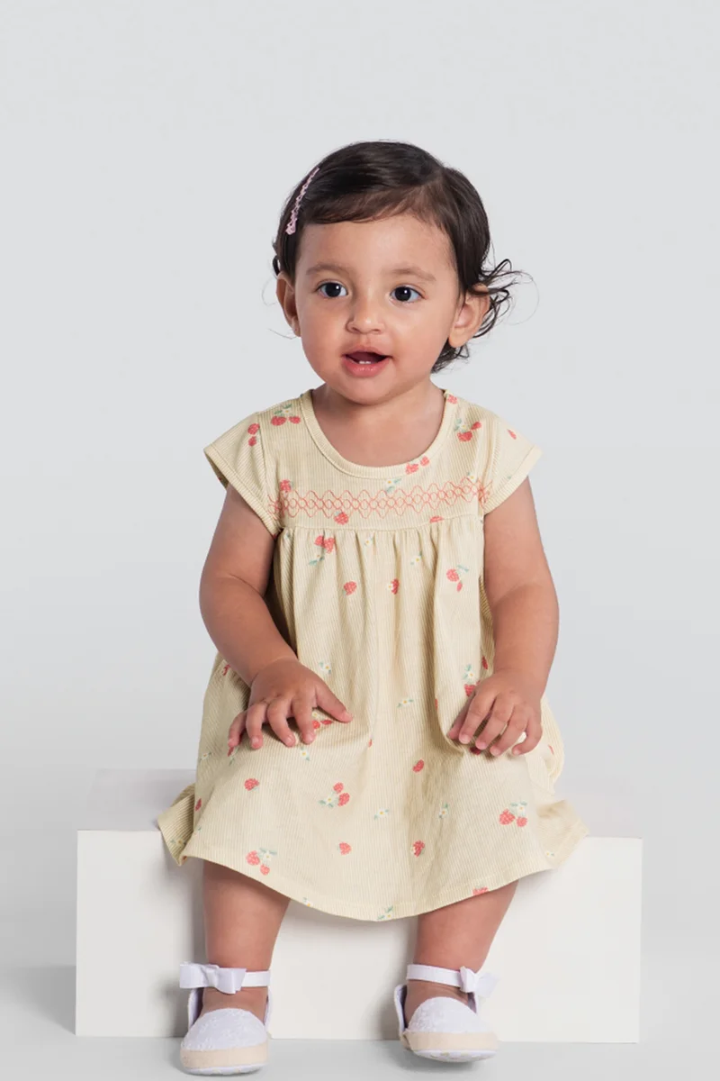 A estampa delicada de cerejinhas adiciona um toque alegre e cheio de fofura ao visual, enquanto a gola redonda valoriza o design clássico e delicado da peça. Com modelagem confortável, o vestido é perfeito para acompanhar as descobertas, brincadeiras e momentos especiais da sua menina.